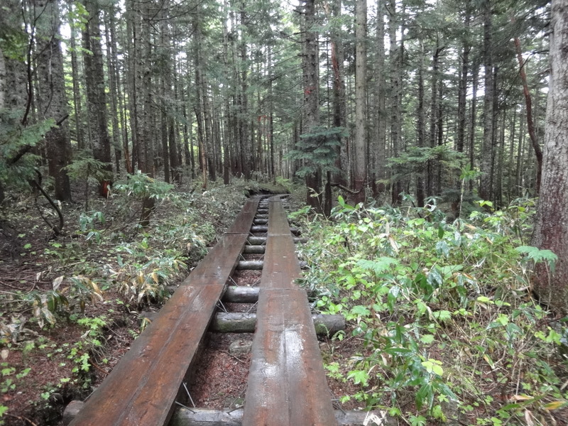 雨の木道はすべるので注意。